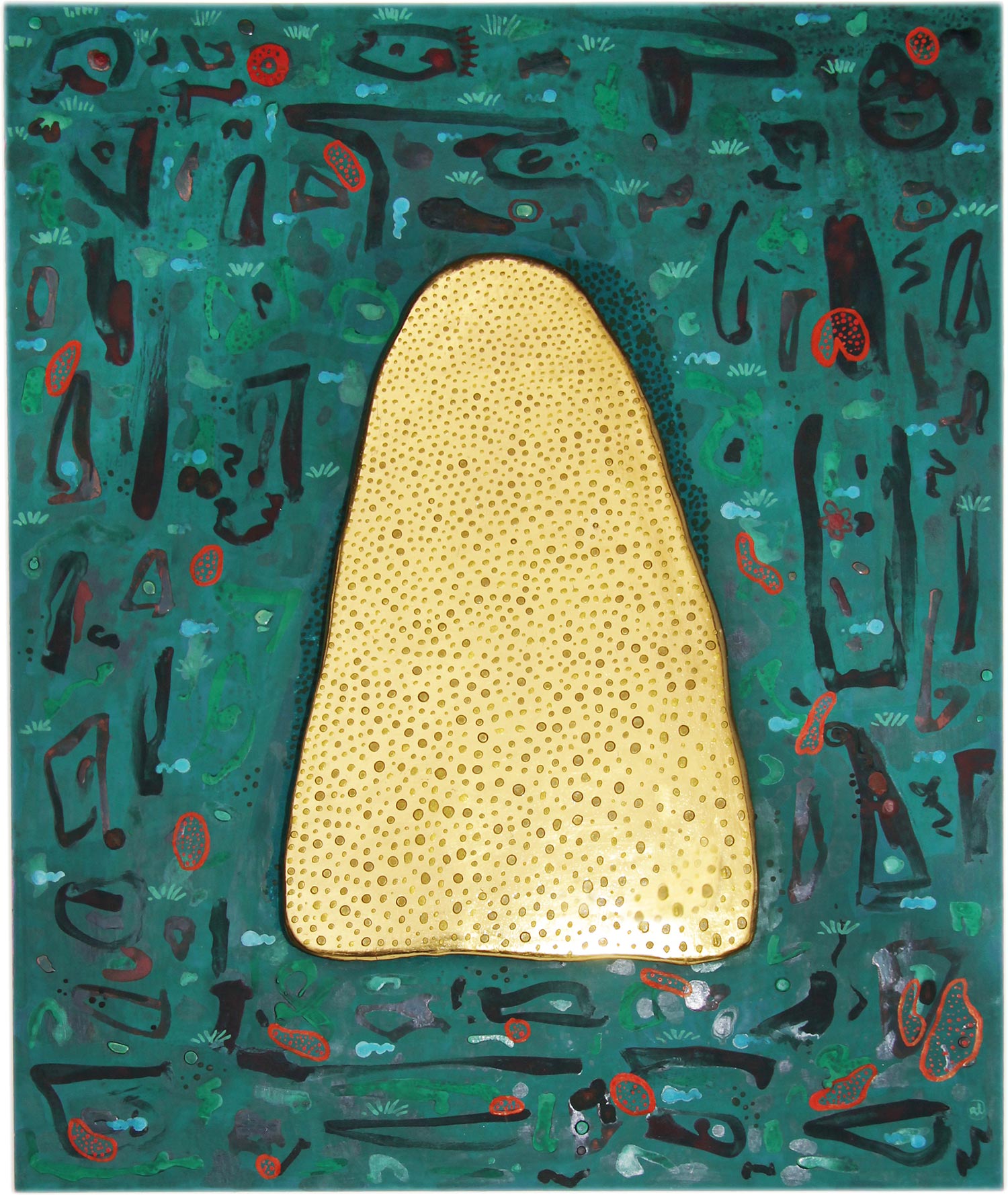67 x 58 cm, 24 Karat Hand vergoldetes, halb plastisches Holzobjekt auf bemaltem Bütten Karton, Museumsglas 2014/15