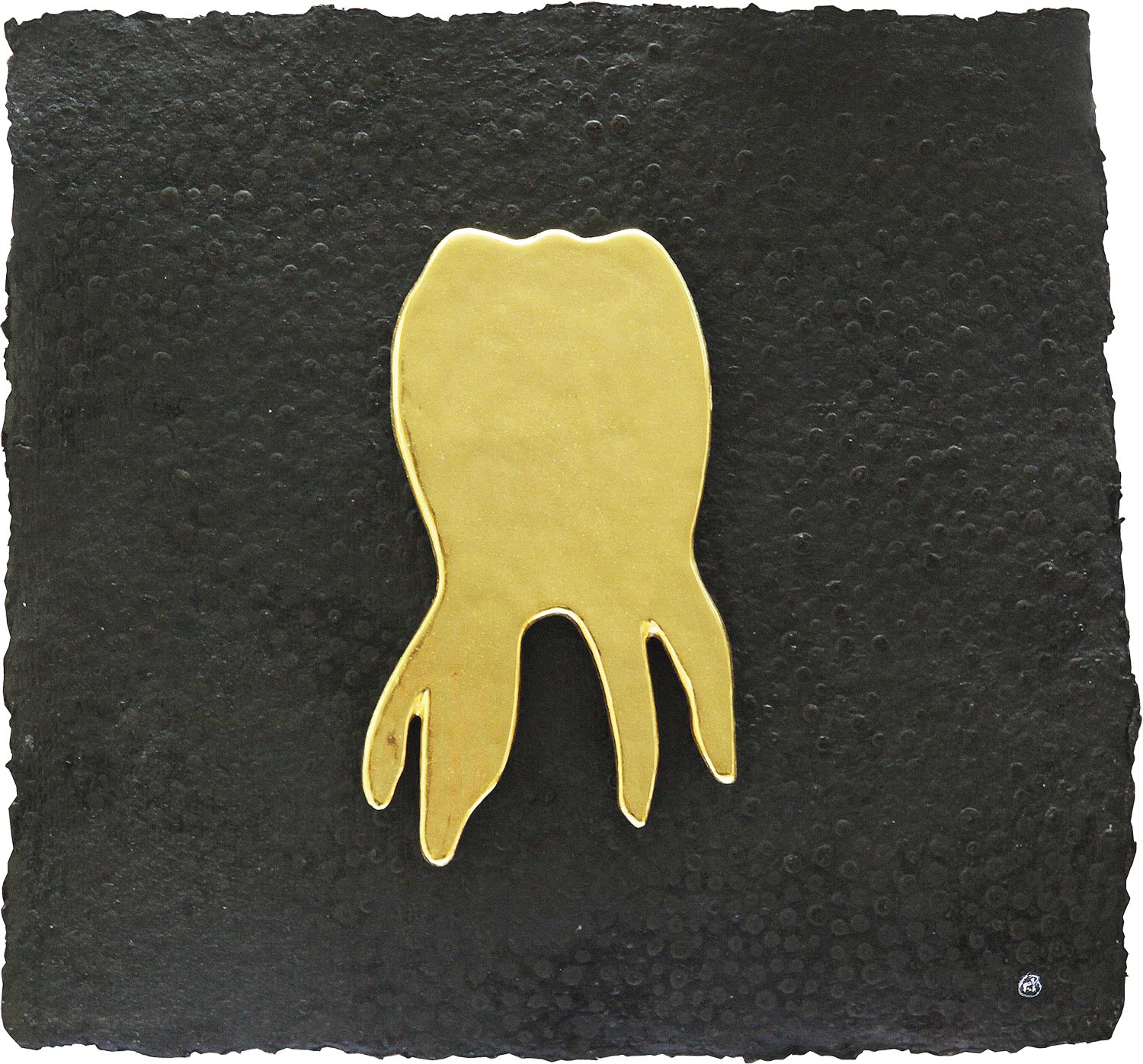 Her mit dem Goldzahn 19. September 201611. März 2018anna_schmidt_berlin 53 x 54 cm, vergoldetes, halb plastisches Holzobjekt 24 Karat, auf handgeschöpftem Bütten Karton, Museumsglas 2014