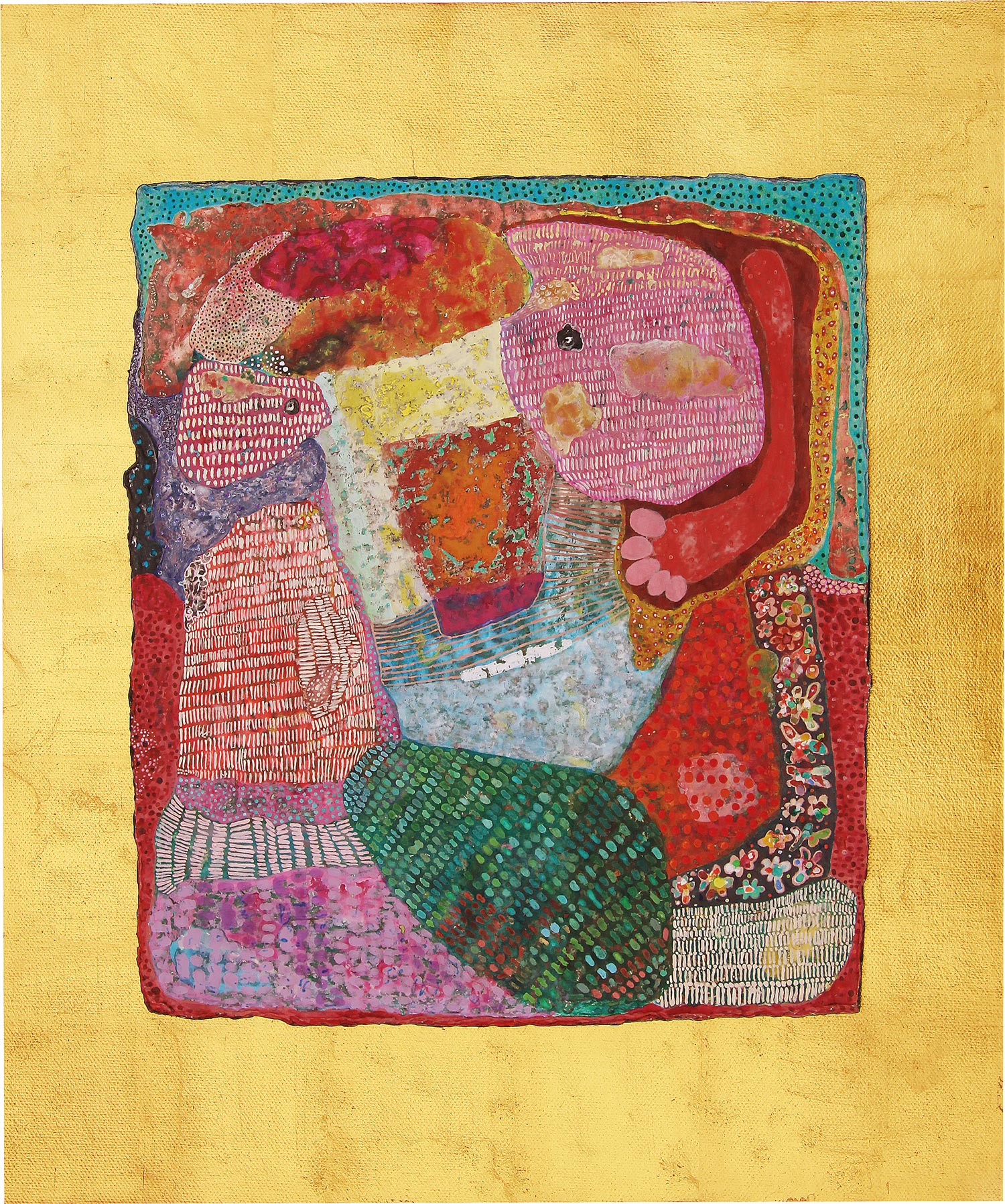 52 x 43 cm, Pigmente, Aquarell, mixed Media, Malerei auf handgeschöpftem Bütten auf 24 Karat Goldgrund Museumsglas 2016