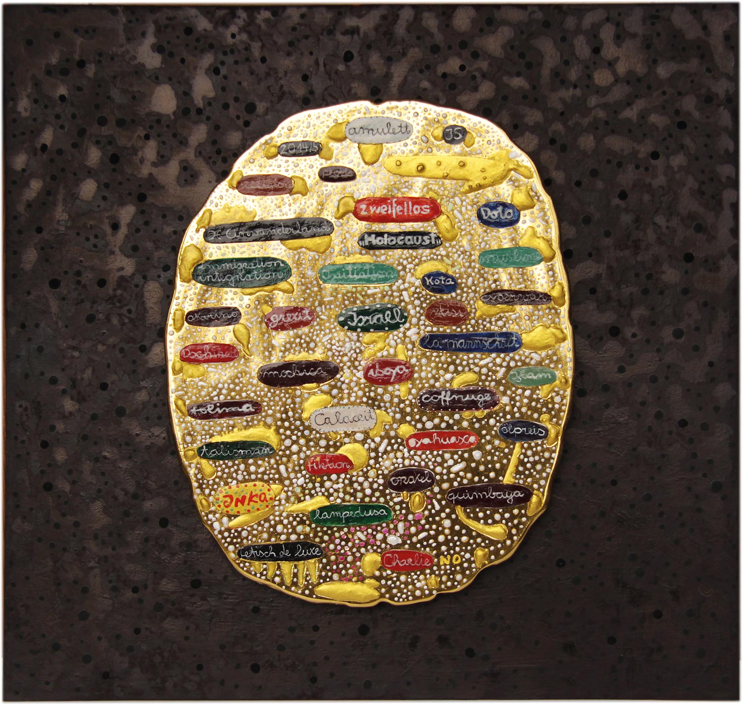 kopfkinoVergoldetes halb plastisches Holzobjekt, 24 Karat + Muschelgold, Objekt bemalt, 60 x 60 cm, Museumsglas 2015