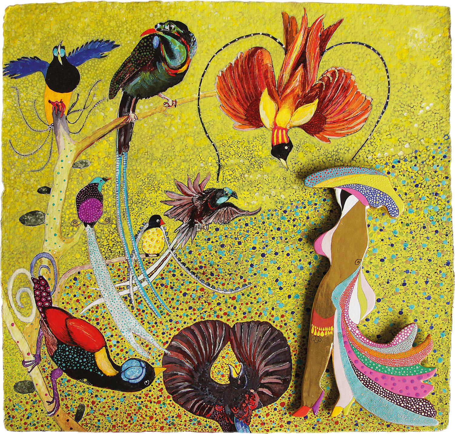 Paradiesvögel 19. September 20164. Oktober 2016anna_schmidt_berlin 24 Karat Hand vergoldetes, halb plastisches Holzobjekt, 78 x 78 cm, Pigmente auf handgeschöpftem Bütten Karton, Museumsglas 2016 Gesichtslose weibliche Figur mit Federschleppe begegnet männlichen Paradiesvögeln (National Geographic).