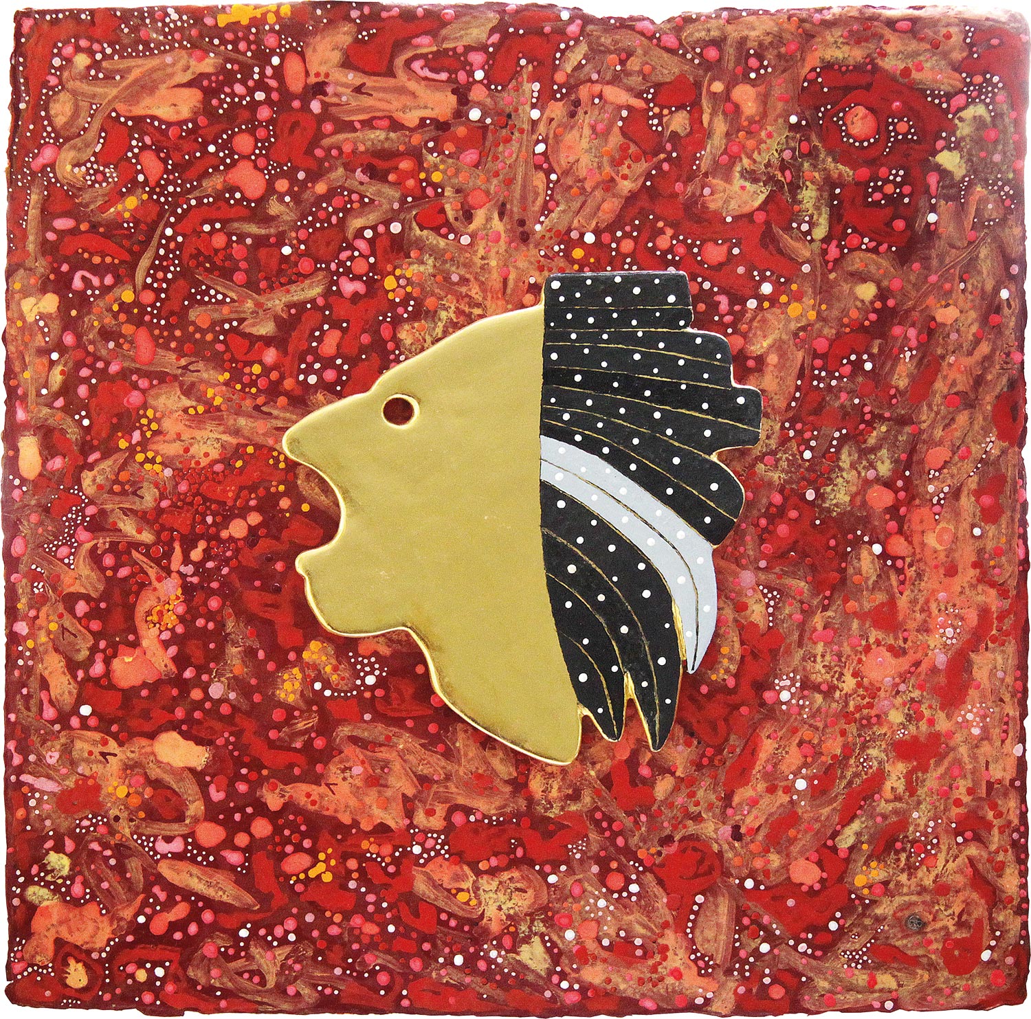 73 x 73 cm, 24 Karat Hand vergoldetes, halb plastisches Holzobjekt, Pigmente auf handgeschöpftem Bütten Karton, Museumsglas 2015
