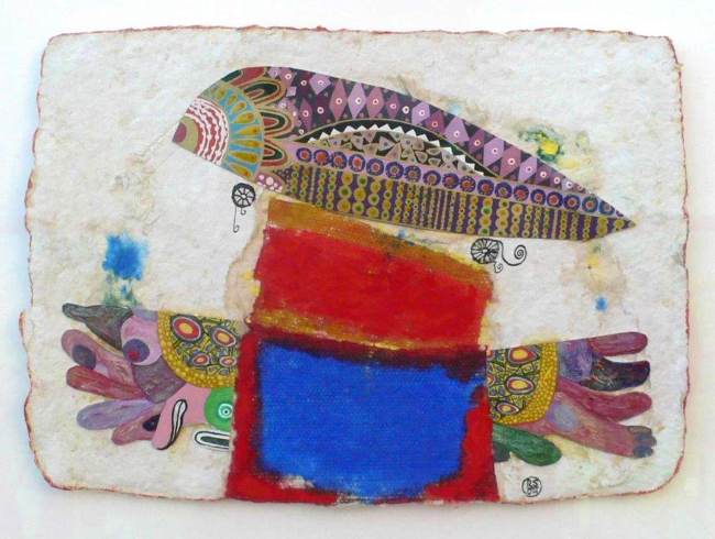Collage und Pigmente auf handgeschöpftem Bütten, Museumsglas, 32 x 37 cm, 2004